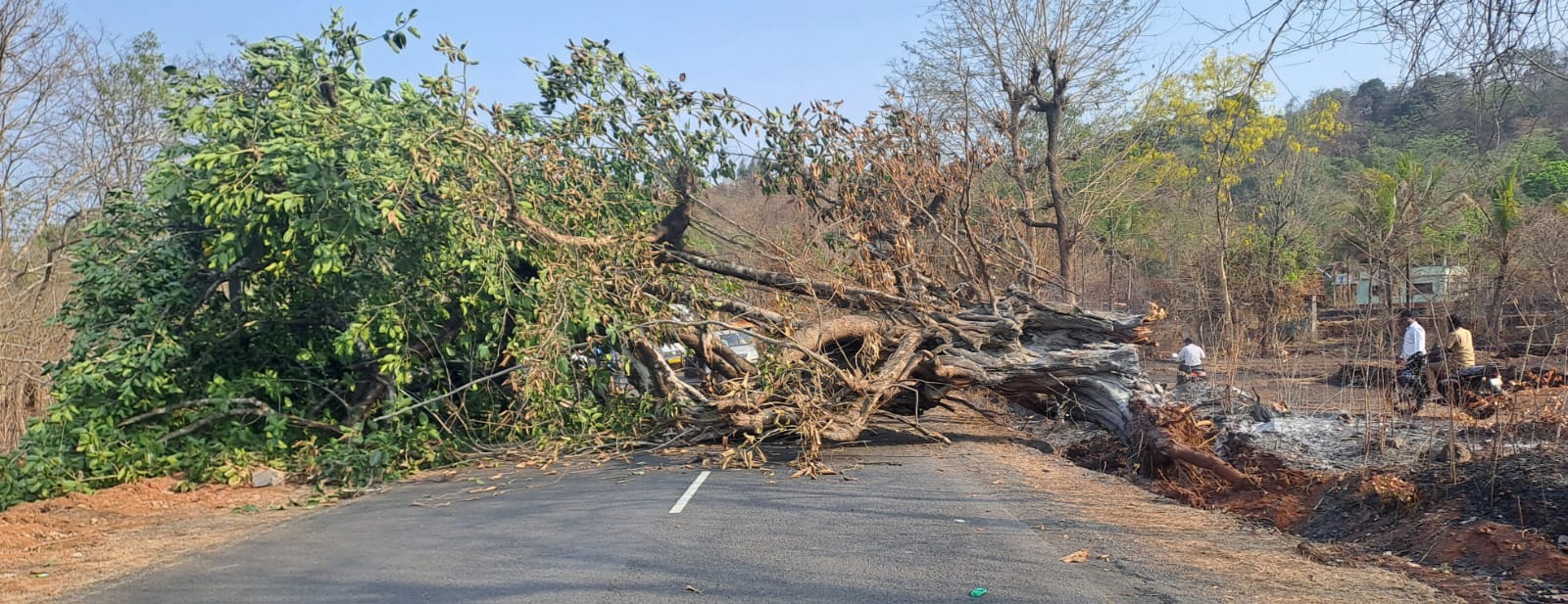 यादरम्यान कोणतेही वाहन नसल्यामुळे मोठी दुर्घटना टळली. रस्त्या मधोमध हा वृक्ष कोसळल्याने वाहतूक तासभर ठप्प होती. याची माहिती मिळाल्यानंतर बांधकाम विभागाचे कर्मचारी घटनास्थळी दाखल झाले होते. ही बाब सामाजिक कार्यकर्ते तथा पत्रकार सचिन मोहिते यांनी सार्वजनिक बांधकाम विभागाचे शाखा अभियंता स्वप्नील चव्हाण यांच्या निदर्शनास आणून दिली. देवरुख बांधकाम उपविभागाने शासकीय ठेकेदार संदीप रहाटे यांचा जेसीबी घटनास्थळी तैनात केला. आणि काही कालावधीत हा वृक्ष बाजूला केल्यानंतर वाहतूक सुरळीत झाली.