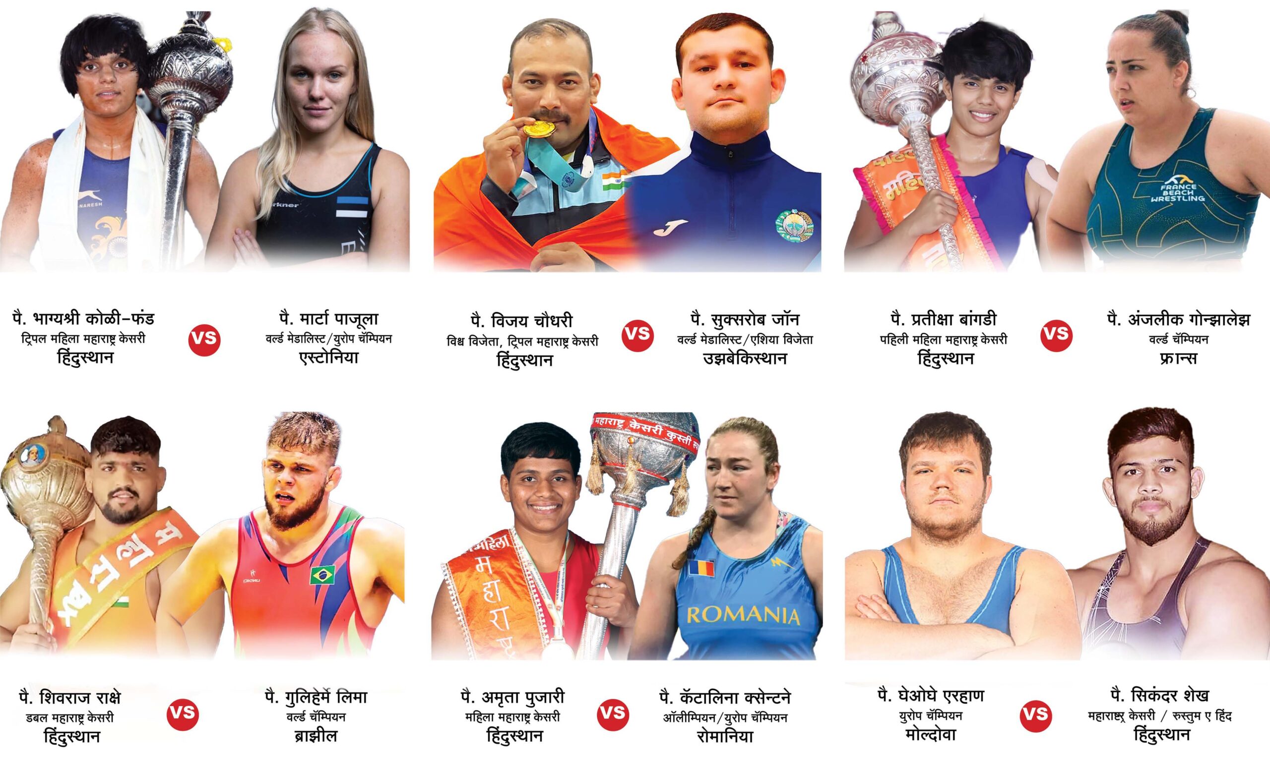 भव्य स्पर्धेत भारतातील नामांकित महिला कुस्तीपटू परदेशी मल्लांविरुद्ध आपली ताकद आजमावणार आहेत. ट्रिपल महिला महाराष्ट्र केसरी भाग्यश्री कोळी ही एस्टोनियाच्या युरोपियन चॅम्पियन मार्टा पाजूलाशी भिडणार आहे. तसेच विजय चौधरी (विश्व विजेता, ट्रिपल महाराष्ट्र केसरी) वि. सुक्सरोब जॉन (एशिया विजेता- उझबेकिस्तान), प्रतीक्षा बांगडी (पहिली महिला महाराष्ट्र केसरी) वि. अंजलीक गोन्झालेझ (वर्ल्ड चॅम्पियन-फ्रान्स), शिवराज राक्षे (डबल महाराष्ट्र केसरी) वि. गुलहिर्मो लिमा (वर्ल्ड चॅम्पियन), अमृता पुजारी (महिला महाराष्ट्र केसरी) वि. कॅटालिना क्सेन्टने (ऑलीम्पियन – रोमानिया), सिकंदर शेख (महाराष्ट्र केसरी) वि. घेओघे एरहाण (युरोप चॅम्पियन – मोल्दोवा), पृथ्वीराज मोहोळ (महाराष्ट्र केसरी) वि. जलाल म्हजोयूब ( आशियाई पदकविजेता – इराण), हर्षवर्धन सदगीर (महाराष्ट्र केसरी) वि. पै. इमामुक (वर्ल्ड चॅम्पियन – जॉर्जिया), सुमित मलिक (अर्जुन पुरस्कार, ऑलिंपियन) वि. पै.जस्सा (शेर ए पंजाब) , पृथ्वीराज पाटील (महाराष्ट्र केसरी) वि. पै. जॉन्टी गुज्जर (आंतरराष्ट्रीय विजेता – दिल्ली ), वेताळ शेळके (भवानी केसरी – महाराष्ट्र) वि. दिनेश गोलिया (आंतरराष्ट्रीय विजेता- हरियाणा), फ्लोरिन ट्रिपोन (युरोप चॅम्पियन – रोमानिया) वि. महेंद्र गायकवाड़ (उपमहाराष्ट्र केसरी), भूपिन्दर सिंह (भारत केसरी – पंजाब ) वि. युधिष्ठिर दिल्ली (राष्ट्रीय विजेता-हरियाणा), कमलजित धूमछडी (रुस्तुम ए हिंद – पंजाब) वि. विक्रांत कुमार (राष्ट्रीय विजेता – हरियाणा), सतेंदर मलिक (भारत केसरी – हरियाणा ) वि. योगेश पवार (उप महाराष्ट्र केसरी), बालाराफिक शेख (महाराष्ट्र केसरी) वि. सोनू (हिमाचल केसरी- हरियाणा), हरियाणा माउली जमदाडे (महान भारत केसरी) वि. मनजीत खत्री (भारत केसरी-हरियाणा), शिवा चव्हाण (राष्ट्रीय विजेता – महाराष्ट्र) वि. रजत मंडोथी (त्रिमूर्ती केसरी – हरियाणा), मुन्ना झुंजुर्के (महाराष्ट्र चॅम्पियन) वि. हरिओमी ट्रॅक्टर (राष्ट्रीय विजेता- दिल्ली), बाळू बोडके (महाराष्ट्र चॅम्पियन) वि. मनजीत मेला (राष्ट्रीय विजेता- हरियाणा), वेदांतिका पवार (उपमहाराष्ट्र केसरी) वि. शिवानी मेटकर (राष्ट्रीय विजेती), अपेक्षा पाटील (राष्ट्रीय विजेती ) वि. सोनाली मंडलिक (राष्ट्रीय विजेती) या २२ प्रमुख लढतीसोबत स्थानिक ३०० महिला आणि पुरुष पैलवानांच्याही जोरदार कुस्त्या पाहायला मिळणार आहे.
