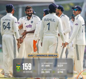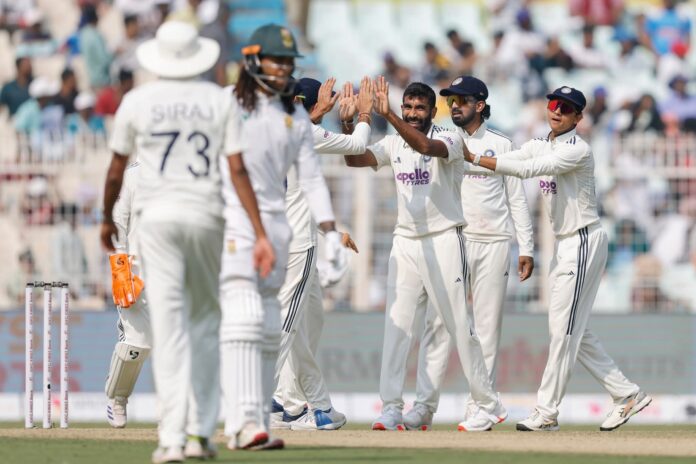 कोलकाता, दि. १४ : भारत आणि दक्षिण आफ्रिका यांच्यातील दोन सामन्यांच्या कसोटी मालिकेतील पहिल्या सामन्याचा पहिला दिवस भारतीय गोलंदाजांच्या नावावर ठरला. ईडन गार्डन्सवर दक्षिण आफ्रिकेचा कर्णधार टेम्बा बावुमानं नाणेफेक जिंकून प्रथम फलंदाजी निवडली; परंतु भारतीय गोलंदाजांच्या अचूक माऱ्यासमोर आफ्रिकेची पहिलीच वेळ फलंदाजी धडाधड कोसळली. संपूर्ण संघ अवघ्या 159 धावांत गारद झाला. जसप्रीत बुमराहनं भेदक लाईन-लेंथसह पाच बळी टिपत दक्षिण आफ्रिकेचा कणा मोडून काढला. मोहम्मद सिराज आणि अक्षर पटेल यांनीही मोलाची साथ देत आफ्रिकन फलंदाजांना दडपणाखाली ठेवले.