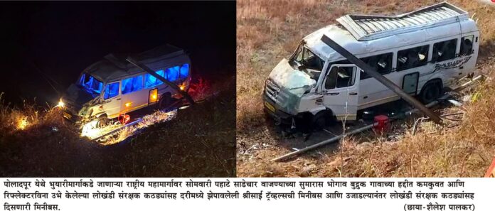 पोलादपूर, २४ (प्रतिनिधी– शैलेश पालकर): मुंबई–गोवा राष्ट्रीय महामार्ग क्रमांक ६६ वर पहाटे घडलेल्या भीषण अपघाताने महामार्गावरील सुरक्षा व्यवस्थेवर प्रश्नचिन्ह निर्माण केले आहे. स्वारगेट, पुणे येथून दापोलीकडे जाणारी खासगी मिनी बस भोगाव बुद्रुकजवळील पुलाच्या आधी रिफ्लेक्टर नसलेल्या लोखंडी संरक्षक कठड्यांना जोरदार धडक देत जवळपास ४५ ते ५० फूट खोल दरीत कोसळली. या भीषण अपघातात बसमधील २२ प्रवासी जखमी झाले असून त्यापैकी १० जणांची प्रकृती अत्यंत गंभीर आहे.