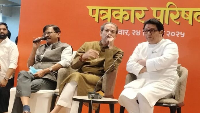 मुंबई, दि. २४ : मुंबईचा महापौर हा मराठीच होणार आणि तो आमचाच असणार, अशा ठाम शब्दांत शिवसेना (उद्धव बाळासाहेब ठाकरे) पक्षप्रमुख उद्धव ठाकरे आणि महाराष्ट्र नवनिर्माण सेनेचे अध्यक्ष राज ठाकरे यांनी ऐतिहासिक युतीची अधिकृत घोषणा केली. वरळी सी-फेस येथील ब्लू सी हॉटेलमध्ये झालेल्या संयुक्त पत्रकार परिषदेत ठाकरे बंधू एकत्र व्यासपीठावर दिसल्याने राजकीय वर्तुळात मोठी खळबळ उडाली असून मराठी राजकारणात नवे समीकरण आकाराला येत असल्याचे स्पष्ट झाले आहे.
