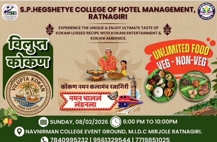 रत्नागिरी, दि. ३१ :- नवनिर्माण शिक्षण संस्थेच्या रत्नागिरी येथील एस. पी. हेगशेट्ये महाविद्यालयाच्या बी.एस.सी. हॉस्पिटॅलिटी स्टडिज (हॉटेल मॅनेजमेंट) विभागातर्फे रविवार, दिनांक ८ फेब्रुवारी २०२६ रोजी ‘विलुप्त कोकण’ या संकल्पनेवर आधारित थीम डिनर कार्यक्रमाचे आयोजन करण्यात आले आहे.