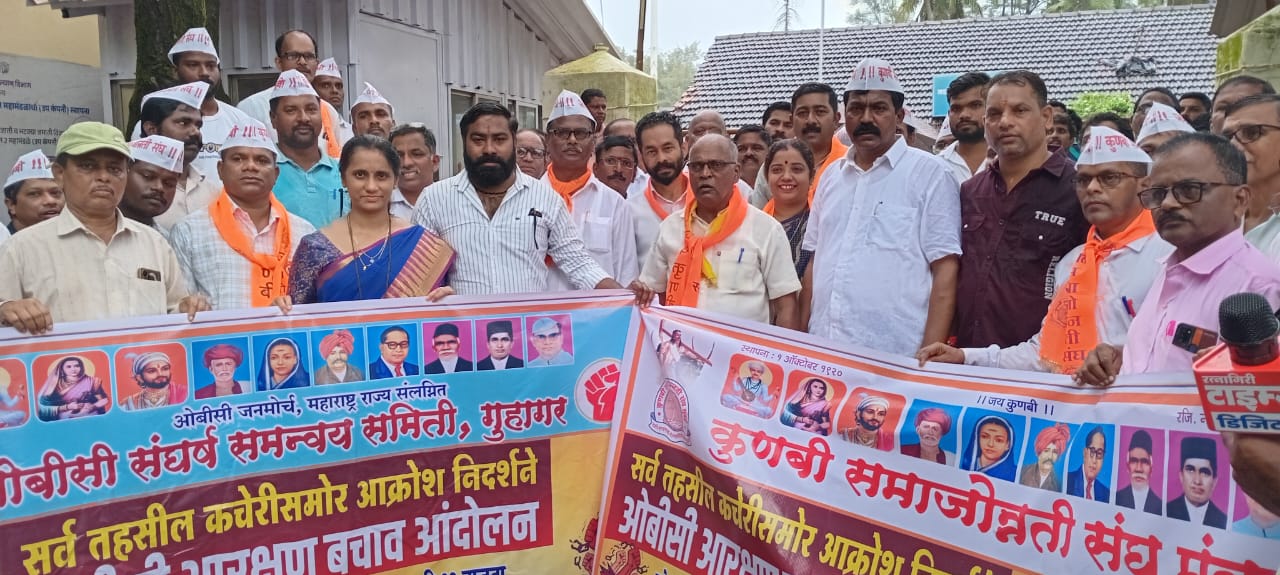 रत्नागिरी, दि. १५ : मराठा समाजाला कुणबी दाखले देऊन ओबीसी आरक्षणात समाविष्ट करण्याच्या कथित प्रयत्नाविरोधात रत्नागिरीत सोमवारी ओबीसी-कुणबी समाजाने तीव्र निदर्शने केली. गुहागर तालुक्यात ओबीसींचा न्याय हक्क व आरक्षण सुरक्षित ठेवण्यासाठी जयस्तंभ पासून तहसील कार्यालयापर्यंत मोर्चा काढला गेला आणि तहसीलदारांना निवेदन दिले.
