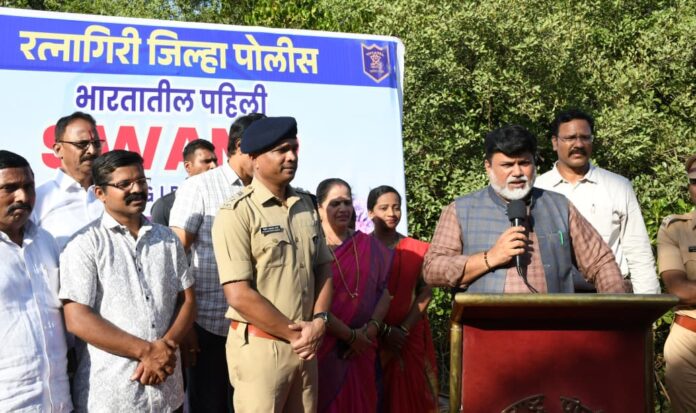 रत्नागिरी, दि. 10 (जिमाका): नारायणमळी, कांदळवन नाचणे येथे भारतात पहिल्यांदाच प्रायोगित तत्वावर राबविण्यात येणाऱ्या ‘स्वॅम्प पोलीस’ (Swamp Police) गस्त उपक्रमाचे उद्घाटन आज पालकमंत्री डॉ. उदय सामंत यांच्या हस्ते श्रीफळ वाढवून व हवेत फुगे सोडून करण्यात आले.