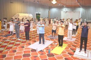 रत्नागिरी, दि. २१ (प्रतिनिधी) : स्वामी रामदेवजी महाराजांच्या आशीर्वादाने आणि मार्गदर्शनाखाली संचालित पतंजलि योग समिती व परिवार, विधी सेवा प्राधिकरण, जन शिक्षण संस्था यांच्या संयुक्त विद्यमाने दहाव्या जागतिक योग दिन शुक्रवारी सकाळी देसाई बॅंक्वेट्स येथे साजरा करण्यात आला.