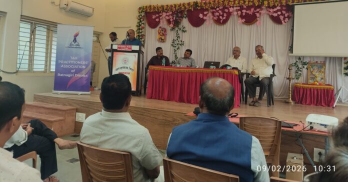 रत्नागिरी, दि. ११ : कर सल्लागार असोसिएशन रत्नागिरी जिल्हा यांच्या वतीने सार्वजनिक विश्वस्त संस्थांच्या ऑडिटमधील ठरावीक व विशेष मुद्दे तसेच आयकर कायद्यातील तरतुदींविषयी मार्गदर्शन करण्याच्या उद्देशाने आयोजित करण्यात आलेले तांत्रिक चर्चासत्र सोमवार, दि. ९ फेब्रुवारी २०२६ रोजी यशस्वीरीत्या संपन्न झाले.