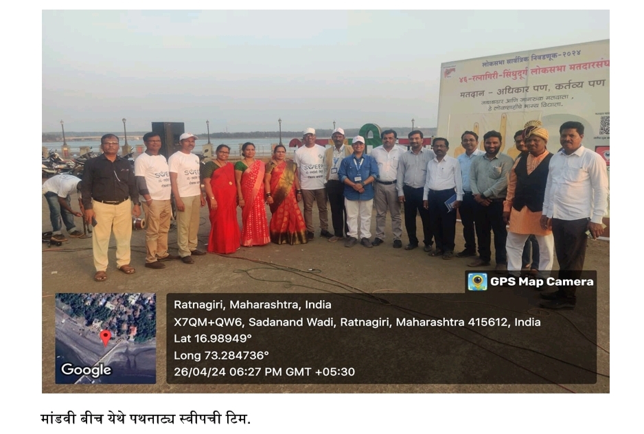 रत्नागिरी, दि. २९ (प्रतिनिधी) : ४६-रत्नागिरी सिंधुदुर्ग लोकसभा मतदार संघ मध्ये नागरिकांनी १०० टक्के मतदान करावे या करीता निवडणूक निर्णय अधिकारी तथा जिल्हाधिकारी आणि सहाय्यक निवडणूक निर्णय अधिकारी तथा उपविभागीय अधिकारी रत्नागिरी यांच्या वतीने विविध उपक्रम राबविले जात आहेत. याचाच एक भाग म्हणून रत्नागिरी नगरपरिषदेचे मुख्याधिकारी तथा लोकसभा निवडणूक २०२४ स्वीप टीम चे जिल्हा सहाय्यक नोडल अधिकारी (शहरी) श्री. तुषार बाबर यांनी स्वीप जनजागृती मोहिमे अंतर्गत मतदानाचे जनजागृती करणे करीता शुक्रवार दिनांक २६/०४/२०२४ रोजी मारुती मंदिर आणि मांडवी बीच रत्नागिरी येथे पथनाटयाचे आयोजन केले होते.