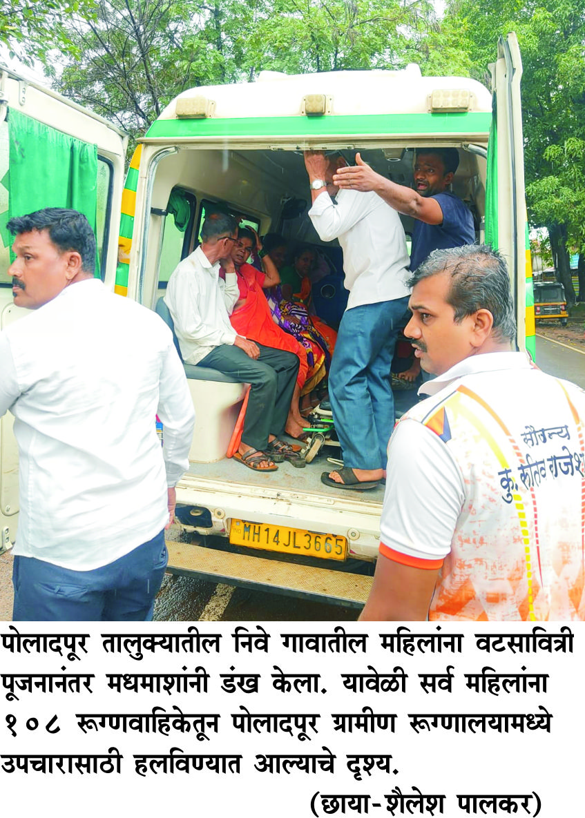 पोलादपूर तालुक्यात सर्वत्र सव्वाशिणींचा वटसावित्रीपूजनाचा सण आनंदात आणि उत्साहामध्ये सुरू असताना अचानक पोलादपूर ग्रामीण रूग्णालयामध्ये तब्बल 11 महिला आणि 1 पुरूष असे 12 जण मधमाशांच्या डंखाने बेजार झाल्याने दाखल करण्यात आल्याची माहिती थडकली. या बातमीने ग्रामीण भागातील सर्वच जण प्रचंड हवालदिल झाले. निवे गावातील वटवृक्षाखाली पाच- सहा महिलांची पूजा झाल्यानंतर आणखी चार पाच जणी वटवृक्षाखाली पुजेसाठी जमल्या. यामुळे सर्वांच्या पुजेनंतर नारळ फोडण्यासाठी महिलांनी साधारण 100 फूट अंतरावर शेतात बांधांवरील गवताची बेणणी करणाऱ्या अनंत नाना तळेकर यांना हाक मारून बोलावून घेतले. यावेळी अनंत तळेकर यांनी नारळावरील सालं काढून तो फोडण्यासाठी आपटणार तोच हजारो मधमाशांनी त्यांना वेढले आणि चावे घेण्यास सुरूवात केली. यावेळी महिलांनादेखील मधमाशांनी डंख करण्यास सुरूवात केली. अशा अवस्थेत अनंत तळेकर यांनी जवळच्या मंदिरामध्ये सर्व महिलांना जाण्यास सांगून मंदिरात पोहोचल्यानंतर मंदिराचा दरवाजादेखील बंद करून घेतला. मात्र, तोपर्यंत महिलांना मधमाशांनी डोक्यावरील केसांमध्ये, चेहऱ्यावर तसेच हातावर आणि मानेवर दंश केल्याने सर्वांनाच वेदना असह्य होऊन त्या मंदिरामध्ये लोळू लागल्या. यानंतर काही वेळाने मधमाशा पांगल्या आणि अनंत तळेकर आणि सर्व महिलांनी ग्रामस्थांशी संपर्क साधून पोलादपूर ग्रामीण रूग्णालयामध्ये सर्व 12 जणांना 108 आणि 102 रूग्णवाहिकेने दाखल केले. यावेळी 108 रूग्णवाहिकेवरील डॉ. नागरे आणि चालक निकम तसेच 102 वरील चालक किरण कळंबे यांनी तातडीने घटनास्थळी पोहोचून रूग्णांना स्थानिक तरूणांच्या मदतीने पोलादपूर रूग्णालयामध्ये आणण्याकामी तत्परता दाखविली.