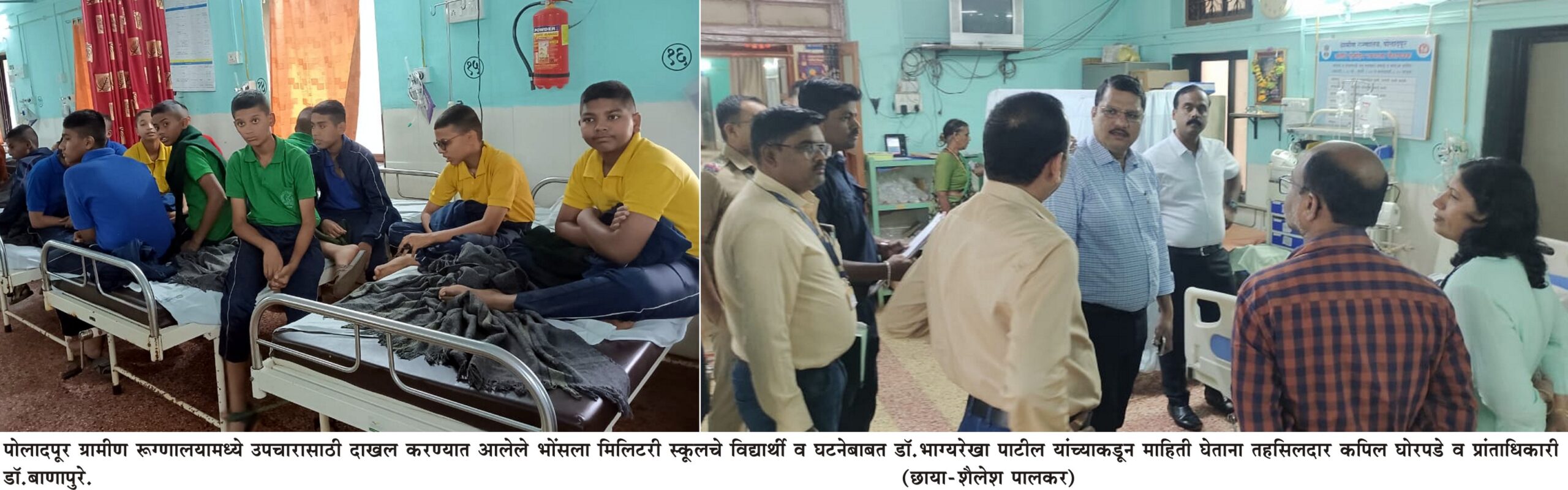पोलादपूर येथील कॅप्टन विक्रमराव मोरे सभागृहात नाशिक येथील भोंसला मिलिटरी स्कुलच्या सहलीसाठी आलेल्या दोन बसमधील 103 विद्यार्थी व कर्मचारी यांना रात्रीच्या मुक्कामासाठी थांबल्यानंतर भोजनाची व्यवस्थाही तिथेच करण्यात आली होती. मात्र, रात्रीच्या भोजनानंतर 103 पैकी 28 विद्यार्थ्यांना उलटी व जुलाबाचा त्रास झाल्याने अत्यवस्थ वाटू लागले. सकाळी 8 वाजता पोलादपूर ग्रामीण रूग्णालयाच्या वैद्यकीय अधीक्षक भाग्यरेखा पाटील, तालुका वैद्यकीय अधिकारी डॉ. वाघतकर व आयुष डॉ.सलागरे यांनी विद्यार्थ्यांवर तातडीने उपचार सुरू केले.